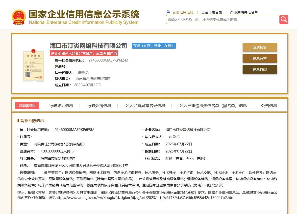 根据国家企业信用公示系统显示, “海口市汀炎网络科技有限公司”统一社会信用代码为:91460000MAEPKP6E5M,注册地址为: 海南省海口市龙华区大同街道大同路36号华能大厦9楼B261室,注册时间为2025年7月22日,注册资金为100万元,法定代表人为康俊龙,占股99.99%;监事为王增学,占股0.01%。资金为认缴制,未实缴分文。